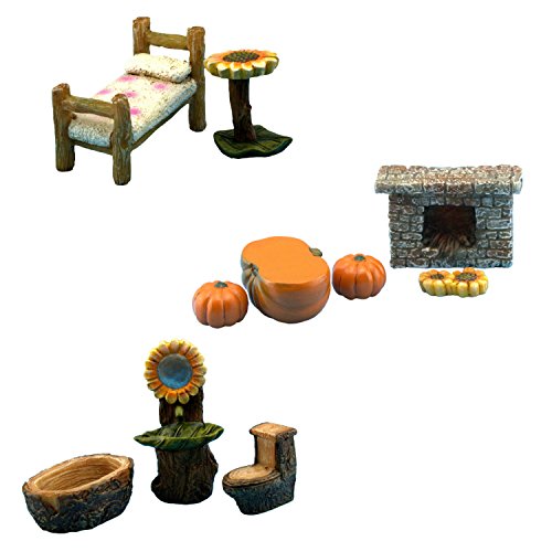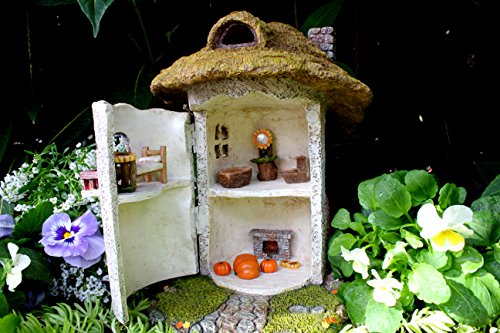 FAIRY GARDEN HOUSE - The Fairy Farm House has a large hinged door that can be opened wide and it is 9.25” high and 6.10” Wide. The set includes a Mini Bedroom Set, a Mini Bathroom Set and a Mini Living Room Set.