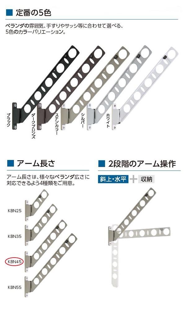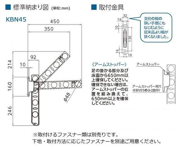 | 仕様 | 用途:腰壁取り付け用の物干し掛け 壁面からの出幅:使用時最大450mm/収納時92mm 耐荷重:30kg(1セットあたり) 取り付けに必要な道具:電動ドリル、プラスドライバー |