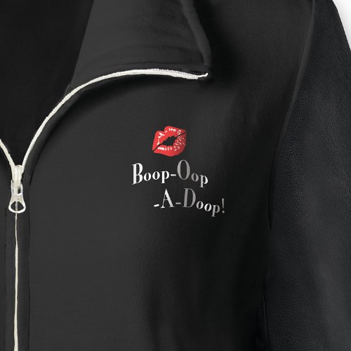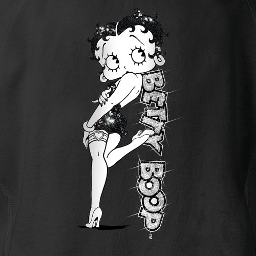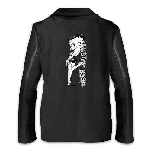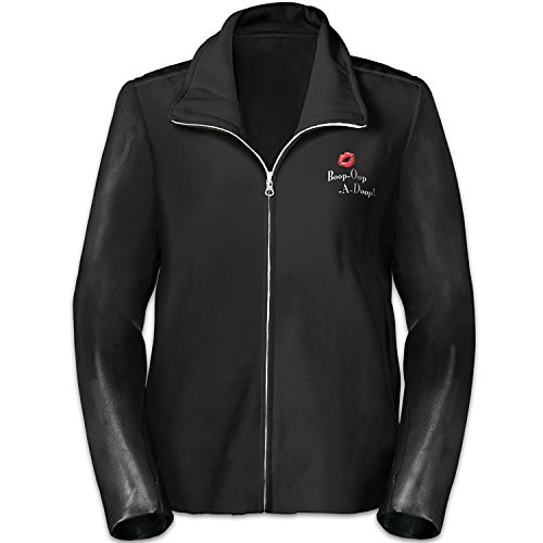 Binding : Apparel Product Description Looking for a way to add comfortable style to your wardrobe as well as a touch of sparkling glamour? Well, if there's an expert in classic stardom, it has to be Betty Boop™ and she recommends this gorgeous women's jacket. A Bradford Exchange fashion exclusive, this Timeless Style Women's Jacket offers the perfect sassy touch of shimmer, wherever you go, what every you do. Boop-Oop-A-Doop!™ Finely crafted in a black cotton knit blend with fashionable black faux leather sleeves, this front-zip women's jacket features a versatile wear-it-up-or-down mock neck collar and silver metallic zipper pull. Best of all, it boasts a gorgeous print of Betty Boop with black sequins on her hair and dress, leaning against the Betty Boop logo adorned in sparkling silver glitter on the back. The front of the jacket is embroidered with "Boop-Oop-A-Doop!" in white and highlighted by a pair of flirty red lips. You're sure to love the way this wardrobe essential puts you in the spotlight, but strong demand is expected so don't wait. Order now! - The front of the jacket is embroidered with "Boop-Oop-A-Doop!" in white, highlighted by a pair of flirty red lips