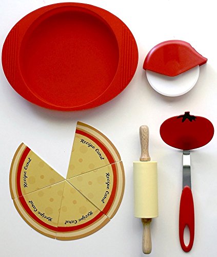 - Gift-boxed set includes silicone pizza pan perfectly sized for two, rolling pin for home-made dough, a child safe pizza cutter, a tomato-shaped serving spatula and five recipe cards