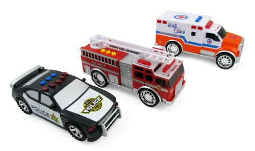 -. Feature : 3 unique emergency vehicles (police car, ambulance, fire truck) / For a truly realistic experience, each car is equipped with flashing lights and 3 unique sound effects. / All 3 emergency vehicles are made of durable plastic for long-lasting use. / Each vehicle is freewheeling and comes already equipped with batteries! / Vehicles Measure 7" in Length