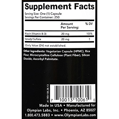-. Binding : Health and Beauty -. Brand : Olympian Labs -. EAN : 8592720368871 -. Feature : Vendor: Olympian Labs / Item: Olympian Labs Vanadyl Sulfate-20 - 20 mg - 250 Capsules / For: Blood Sugar Support / Item UPC No: 710013100610 / Dairy Free - Yeast Free - Vegan -. IsAdultProduct : 0 -. Label : OLYMPIAN LABS -. LegalDisclaimer : PLEASE NOTE: Product image is representative of the product offered but may not have the exact attributes. Please read product description for the specific attributes of this product. The information above is intended for reference only. While we attempt to keep our information accurate, we cannot guarantee it is an accurate representation of the latest formulation of the product. If you have any concerns, please visit the vendor's web site. The information above are the views of the product's manufacturer. These statements have not been evaluated by the Food and Drug Administration. This product is not intended to diagnose, treat, cure or prevent any disease. -. Manufacturer : OLYMPIAN LABS -. MPN : 010013100610 -. PackageQuantity : 1 -. PartNumber : 010013100610 -. ProductGroup : Health and Beauty -. ProductTypeName : HEALTH_PERSONAL_CARE -. Publisher : OLYMPIAN LABS -. Studio : OLYMPIAN LABS -. Title : Olympian Labs Vanadyl Sulfate-20 - 20 Mg - 250 Capsules