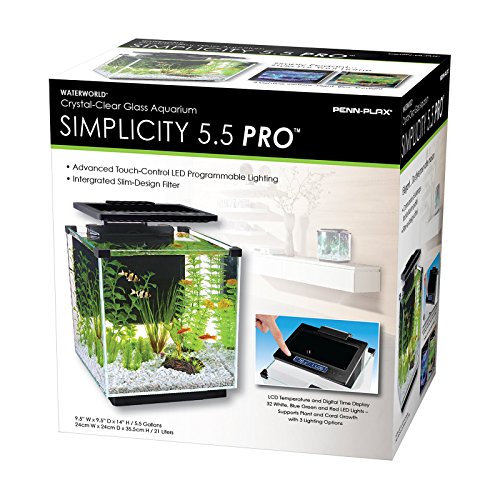 Studio : Penn Plax, INC. Publisher : Penn Plax, INC. Binding : Misc. Product Description This Simplicity 5.5 gallon Seamless Curved Glass Aquarium Desktop Tank includes a high quality touch control thermometer lighting with 39 bulbs. Color lighting options-choose white, red, blue or green lighting. Also included is an Internal Hang-On Filter, Super Clear Glass and Clear Glass Lid. Penn Plax Inc. has been in the business of making quality and innovative pet products for over 50 years. 0