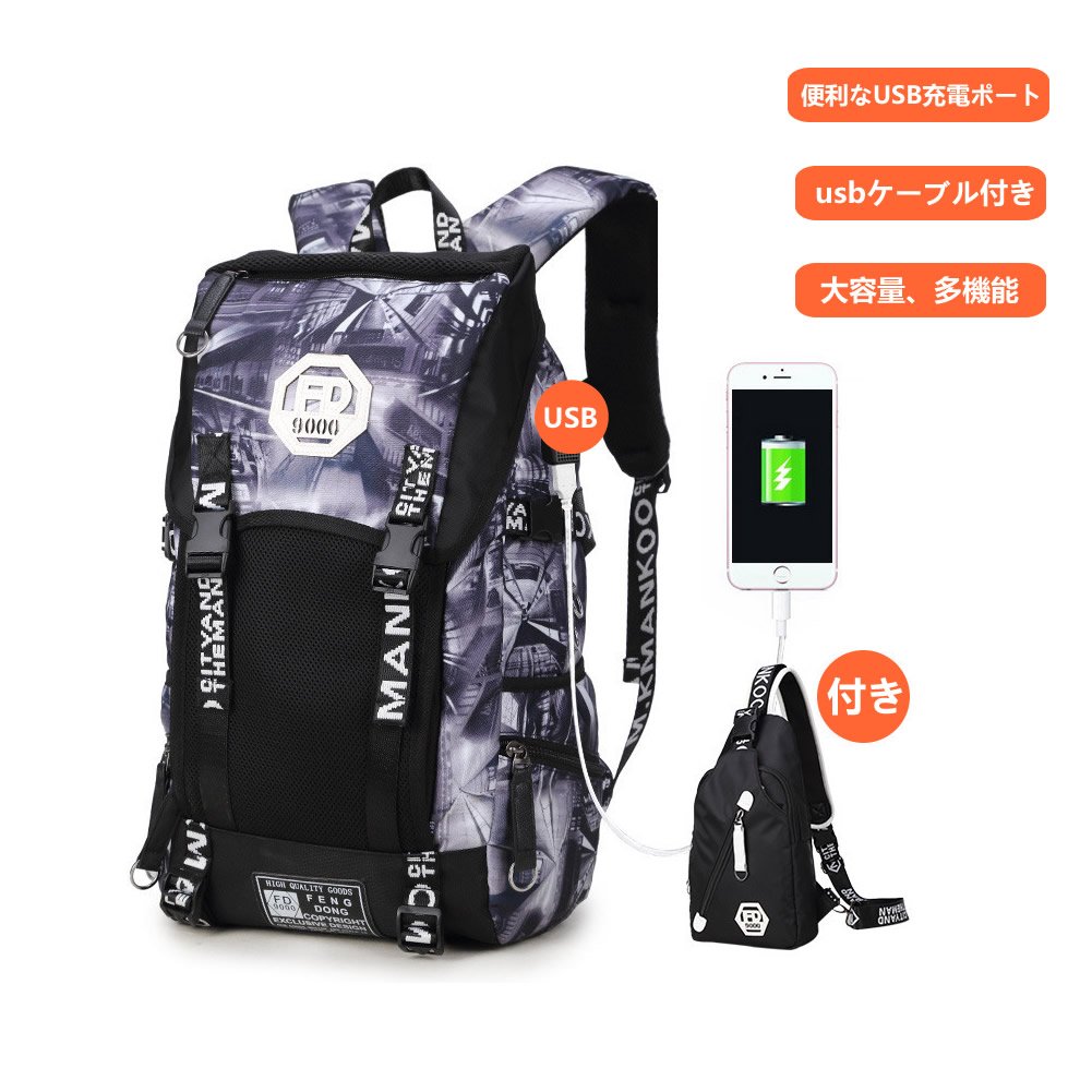 D, inner pocket E, front pocket F, USB charging port
