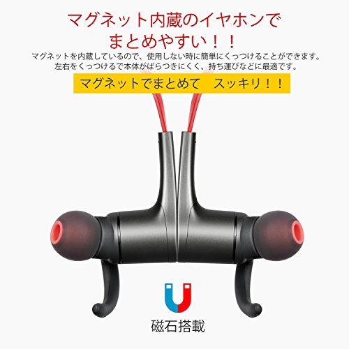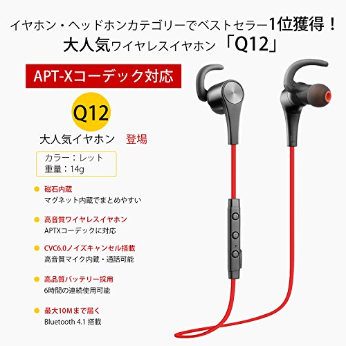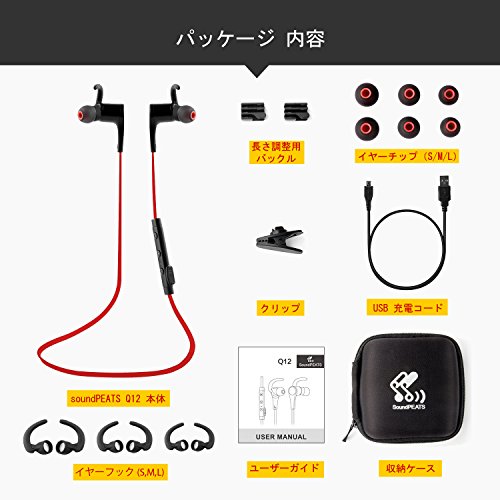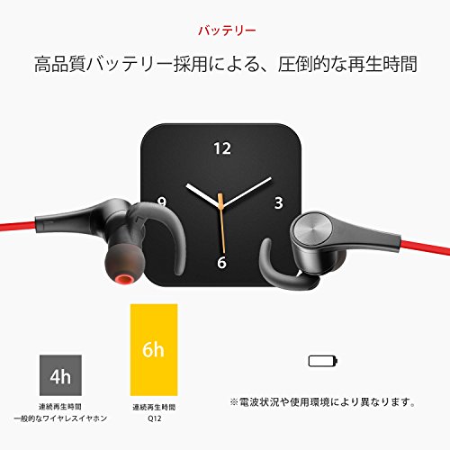 1) 【人間工学に基いたスポーツデザイン・マグネット搭載・6時間連続使用】 Q12の最大の特徴はそのデザインです。コンパクトで軽く、快適に装着できます。耳の上部にフィットする柔らかなフックを装着しており、イヤホンを耳にしっかりと固定できます。ランニングやジョギング、スケートなど運動時、また運転など外で仕事する際も外れることがないため、とても重宝できます。 【マグネット搭載】使用しない時は首に回したまま耳から外してそのままマグネット同志を付ければ首輪状になり落下防止につながります。 【大容量バッテリー】1回約2時間の充電で約6時間の連続使用(通話・音楽再生)と180時間の待機ができます(東京大阪間を往復可能)ので、通勤通学の行きかえりなどの際にも安心してご使用いただけます。また、接続したiOSデバイス(iPhone、 iPad、iPodなどApple社の製品)にはバッテリー残量も表示できます。