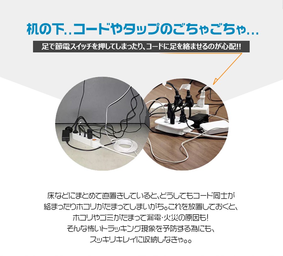 | 商品説明 | ゴチャゴチャしたケーブル類をすっきり収納整理! ルーターやタップ、ケーブルをホコリから守り、配線がスッキリ!コンセント周りのごちゃごちゃ配線を解消します!卓上でも邪魔にならないスリムタイプ。 |