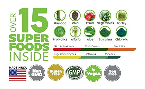 LOADED WITH OVER 15 SUPER FOODS: Spirulina, Chlorella, Bamboo, Chia, Alfalfa, Barley Grass, Kelp, Beet, Acai, Kale, Spinach, Aloe Vera, Broccoli, Goji Berries, Tumeric, and more!