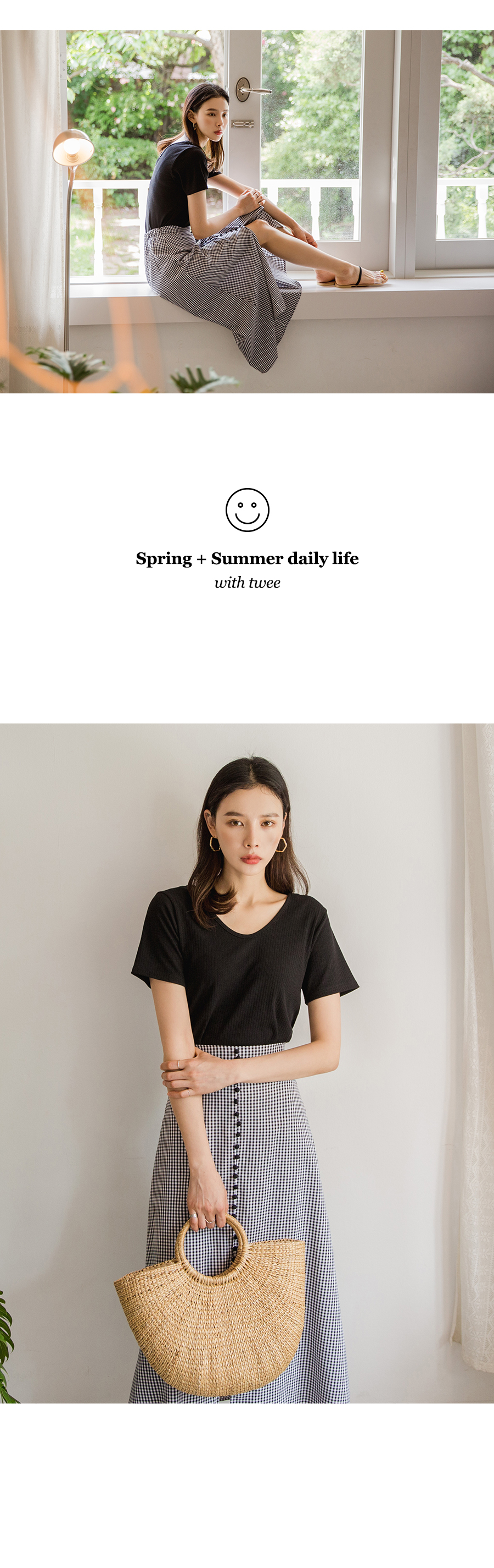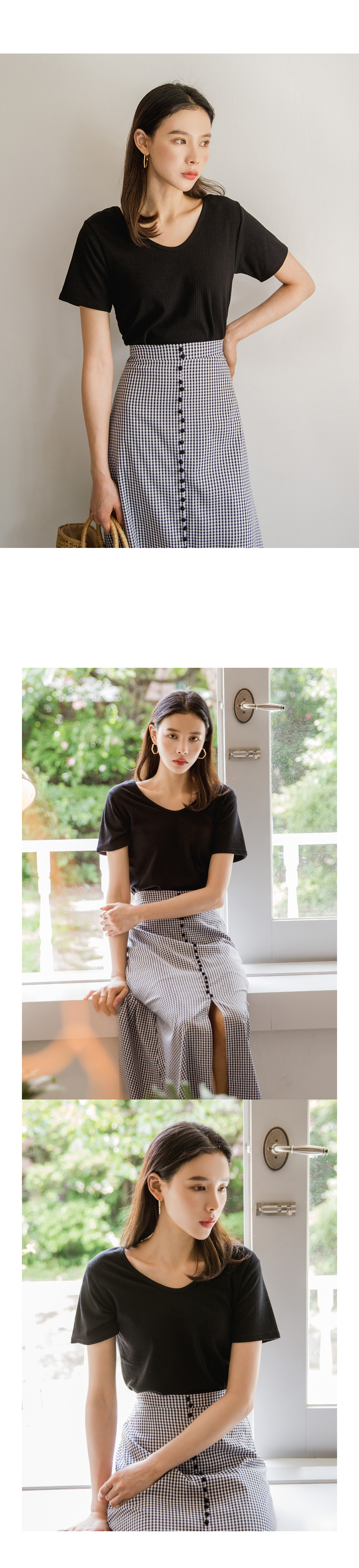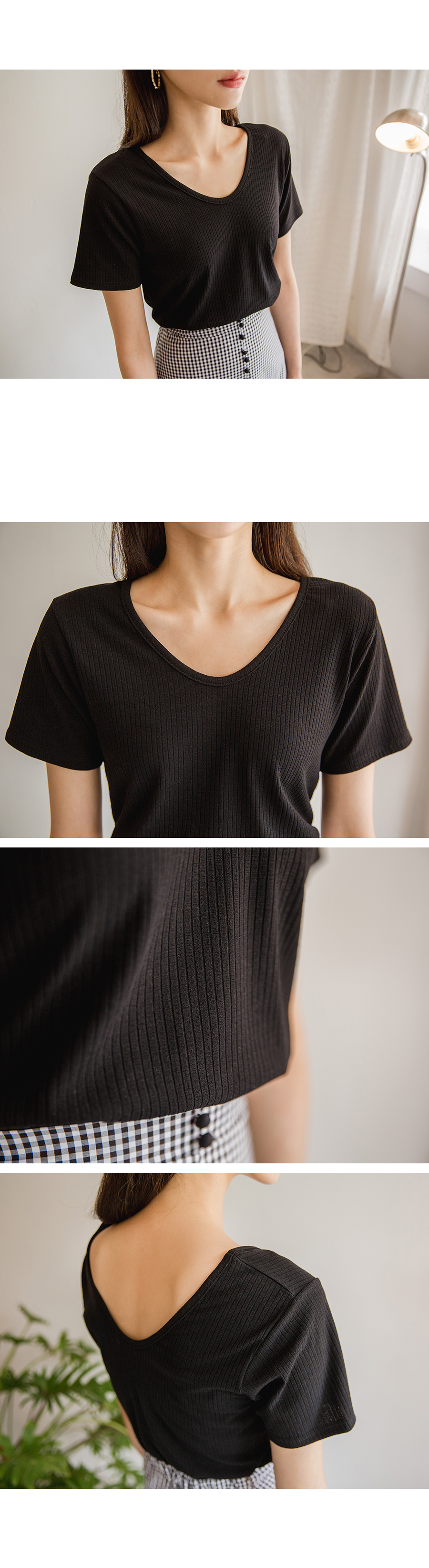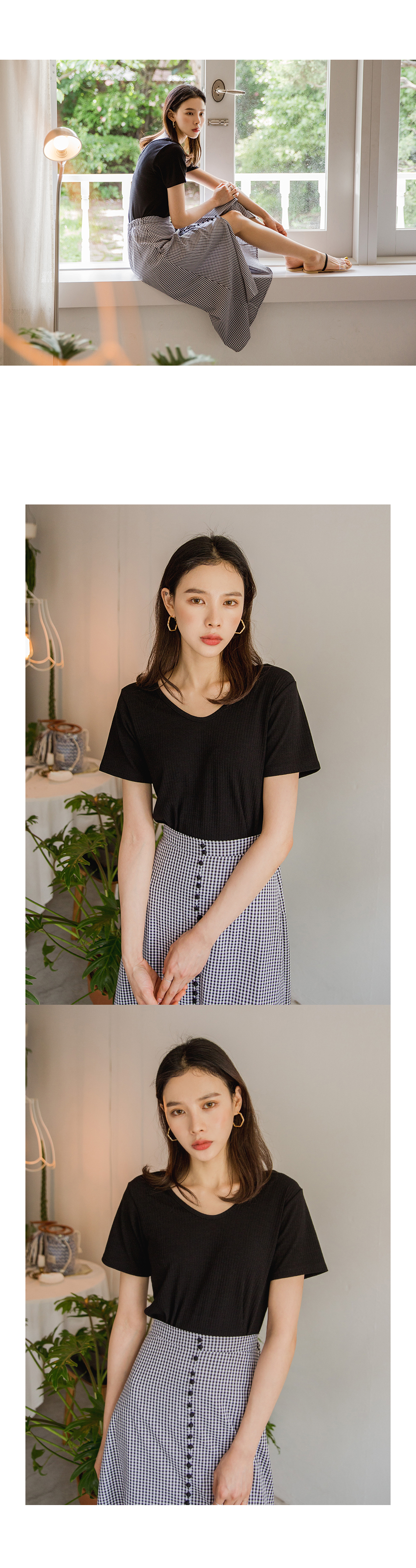MD COMMENT베이직하면서도 페미닌한 무드의양브이 티셔츠입니다 쫀쫀한 텐션감으로 바디라인을 슬림하게 잡아주어여성스러운 느낌을 강조해줍니다 V네크라인으로 시원보이면서 목선을 여리여리하게 연출해주어요 베이직한 디자인으로 다양한 종류의 하의와도 매치하기 쉬워데일리하게 즐기식좋은 아이템이에요!
