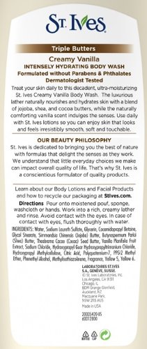 -. Feature : Nourishes Skin with Creamy Jojoba, Shea & Cocoa Butter / Treat your skin daily to this decadent, ultra-moisturizing St. Ives Creamy Vanilla Body Wash. / The luxurious lather naturally nourishes and hydrates skin with a blend of jojoba, shea, and cocoa butters, while the naturally comforting vanilla scent indulges the senses / Use daily with St. Ives lotions so you can enjoy skin that looks and feels irresistibly smooth, soft and touchable. / Dermatologist tested, Formulated without parabens and phthalates