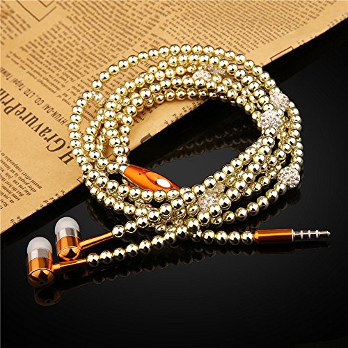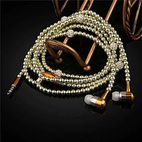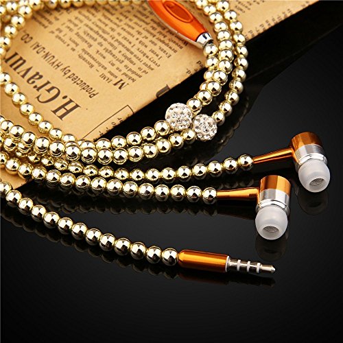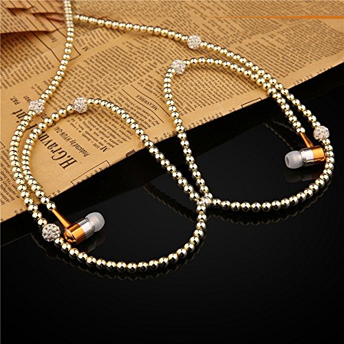 Fashionable Jewelry Pearl Necklace Earphones Headset with Mic Beads 3.5mm In-ear Earbuds wired Headphone for Ipod, Iphone, Android, Blackberry, Mp3 Player And All 3.5mm Audio Devices (Gold)