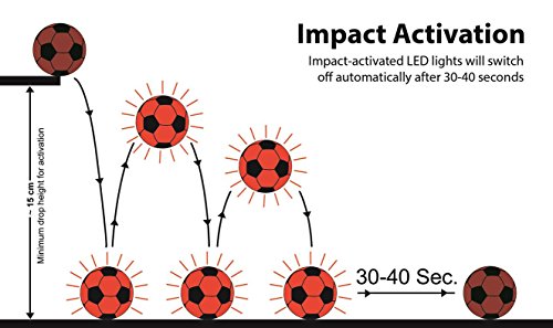 -. Feature : IMPACT ACTIVATED LEDs - Two high quality LED lights located inside the football make this ball light up and glow when bounced or kicked! It will only stay lit up when actively played and will automatically switch off after 30 seconds without action. There is no mechanical switch on the ball. This ball is much brighter than other "glow in the dark balls" you may find. They actively glow using battery powered LEDs - they are NOT just passively using fluorescence. / BALL PUMP, BATTERIES AND EXTRA-SET OF SPARE BATTERIES INCLUDED - The ball is delivered deflated like most other balls. A proper standard ball pump is included to easily inflate the ball and you can use it for other balls as well! The ball comes with mounted batteries and is ready to play. An extra set of spare batteries is included additionally. The batteries will last about 30 hours of playing and are easy to replace. A tool and a manual are included to make battery changing even easier. / HIGH QUALITY - This ball is not one of these cheap toys that will only last a couple of days. It plays just like a normal soccer ball. It is made from high-quality materials, is very sturdy, durable and even waterproof! / OFFICIAL SIZE & WEIGHT - This ball matches the official SIZE 3 and weight. It measures: Circumference = ~62 cm / 24 inch, diameter = ~ 19 cm / 7.5 inch, weight = ~ 290 g / 10 oz. The size 3 is a youth size suitable for children and youngsters. / GREAT FUN - enjoy playing soccer in twilight and dark. You, your kids, friends and even your soccer club team members will love it! The ball is very bright in the dark and can be seen from far distances!