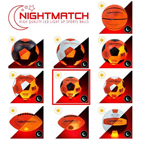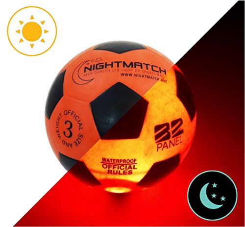 -. Title : NightMatch Light Up Soccer Ball Kids Edition INCL. BALL PUMP and SPARE BATTERIES - Inside LED lights up when kicked - Glow in the Dark Soccer Ball - Youth Size 3 - Official Size & Weight -orange/black