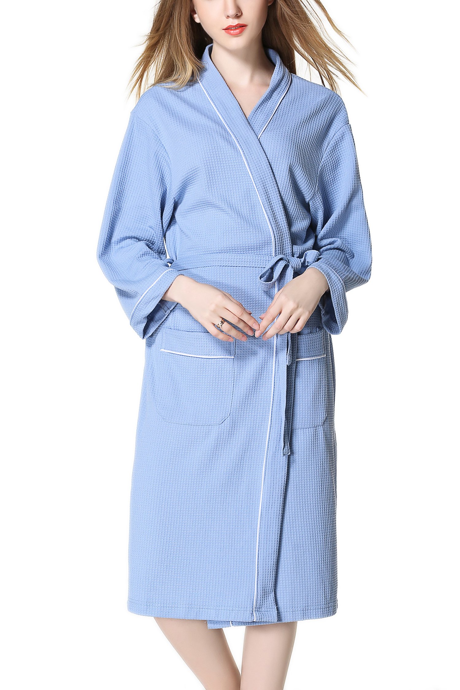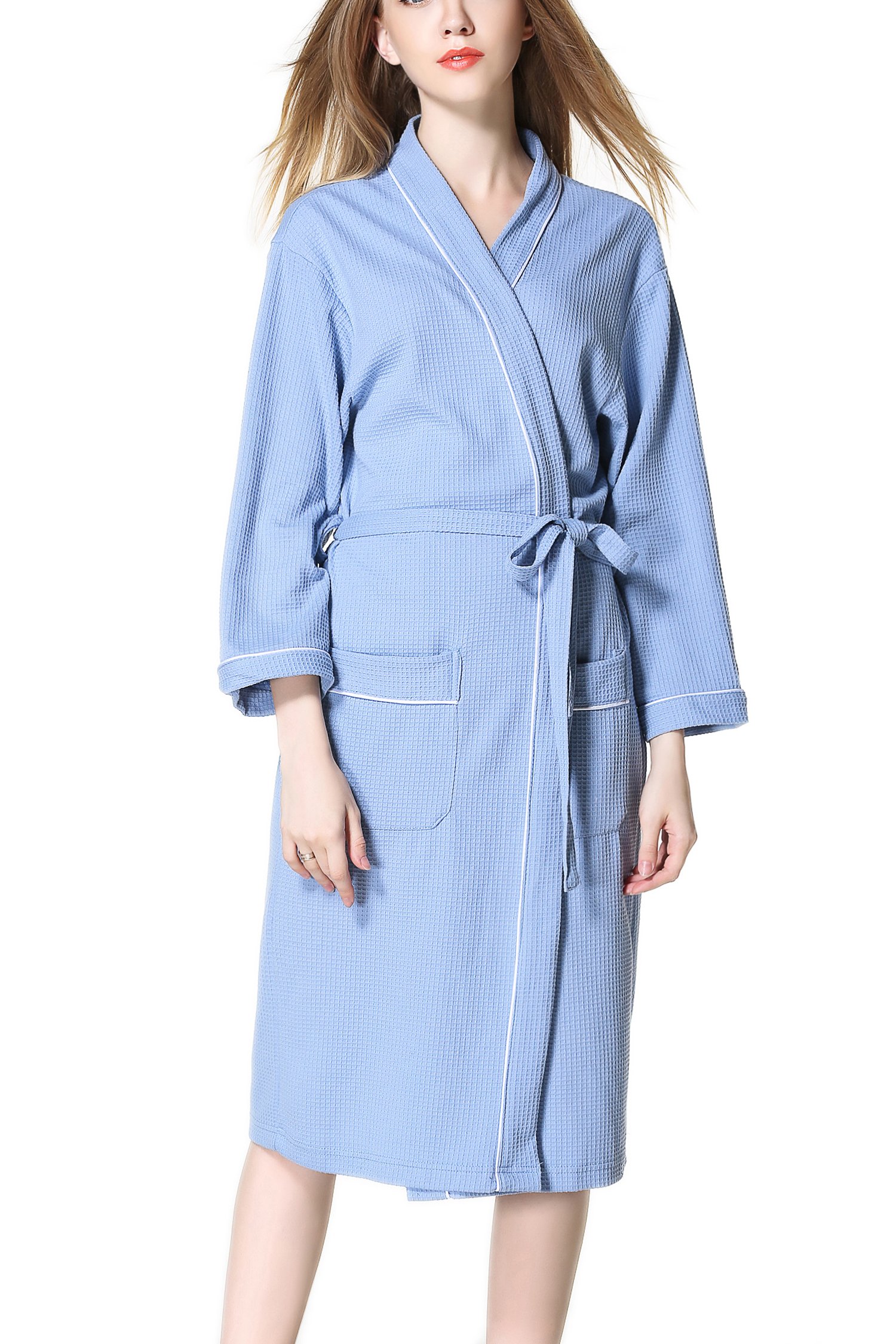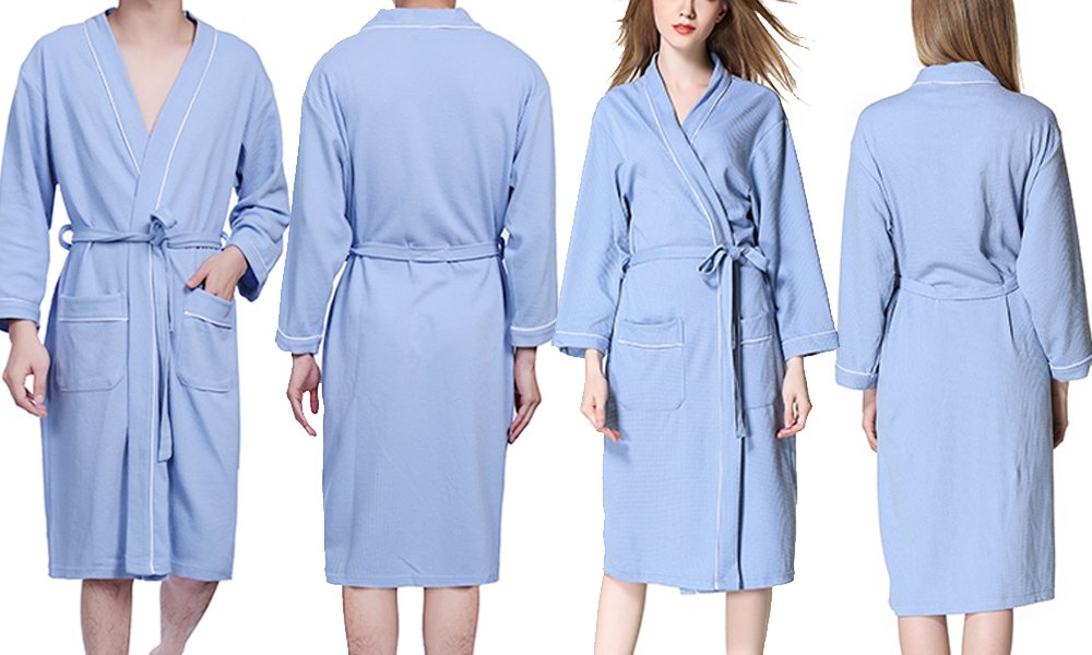 This is a unisex bathrobe with waffle fabric cotton material