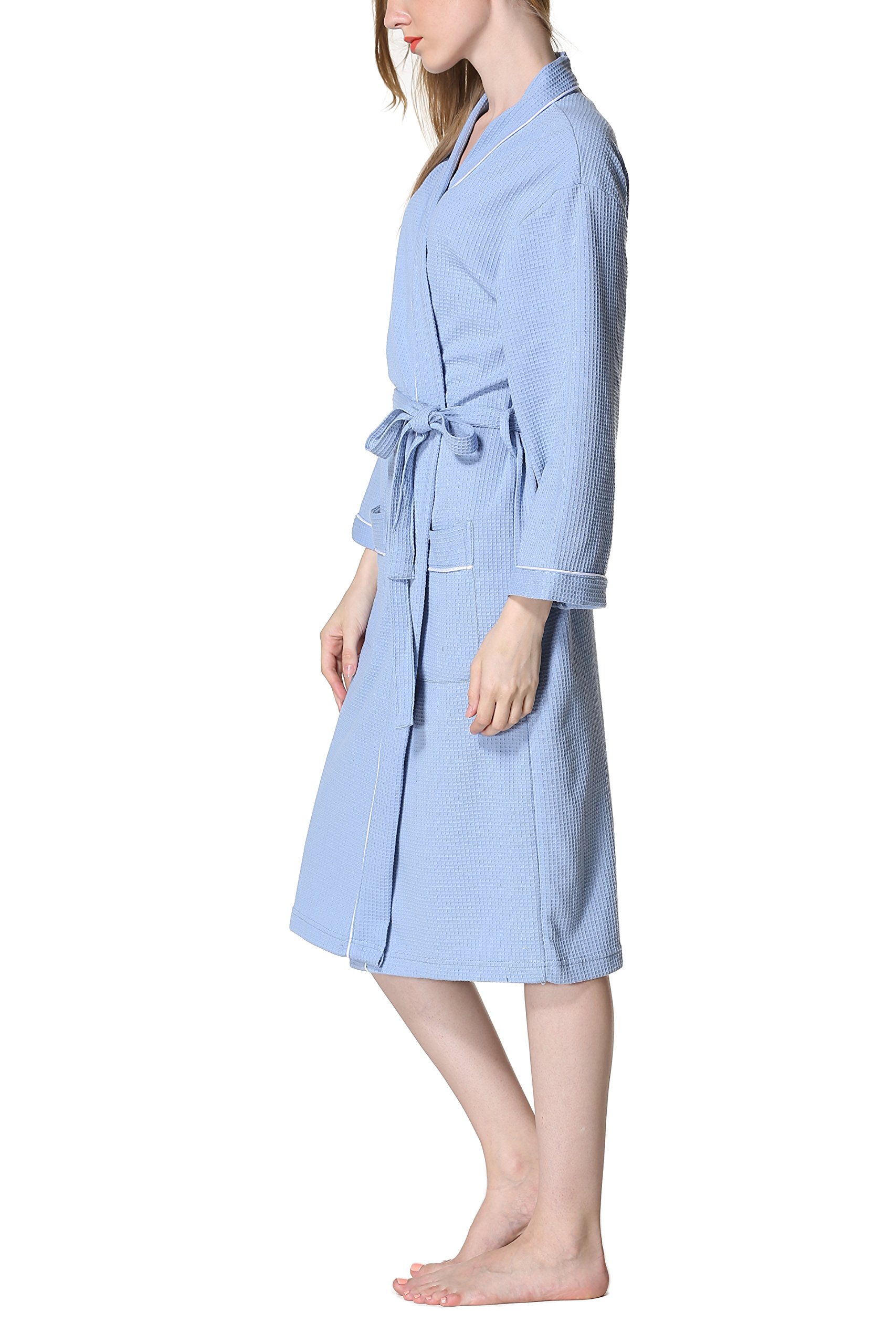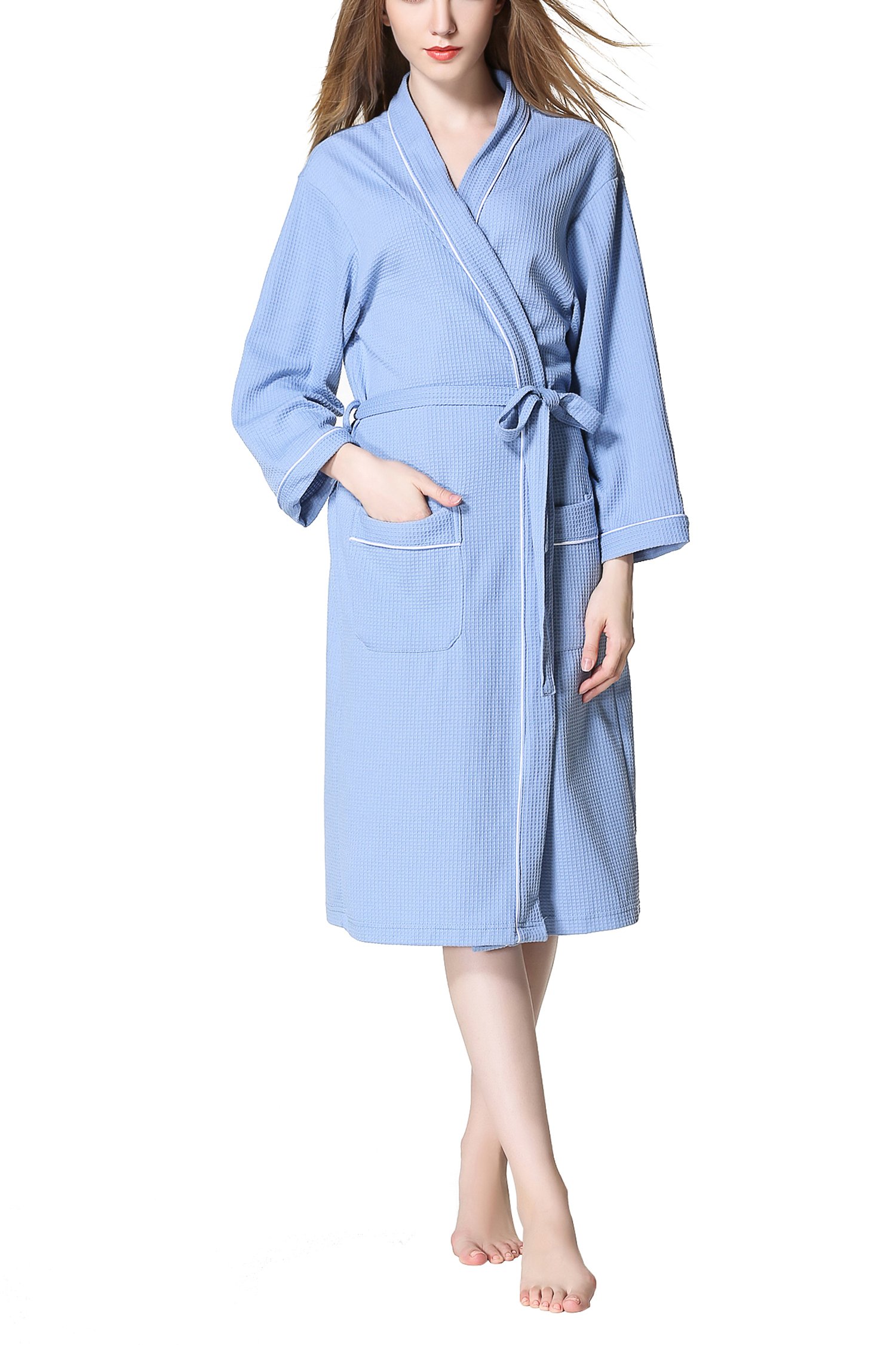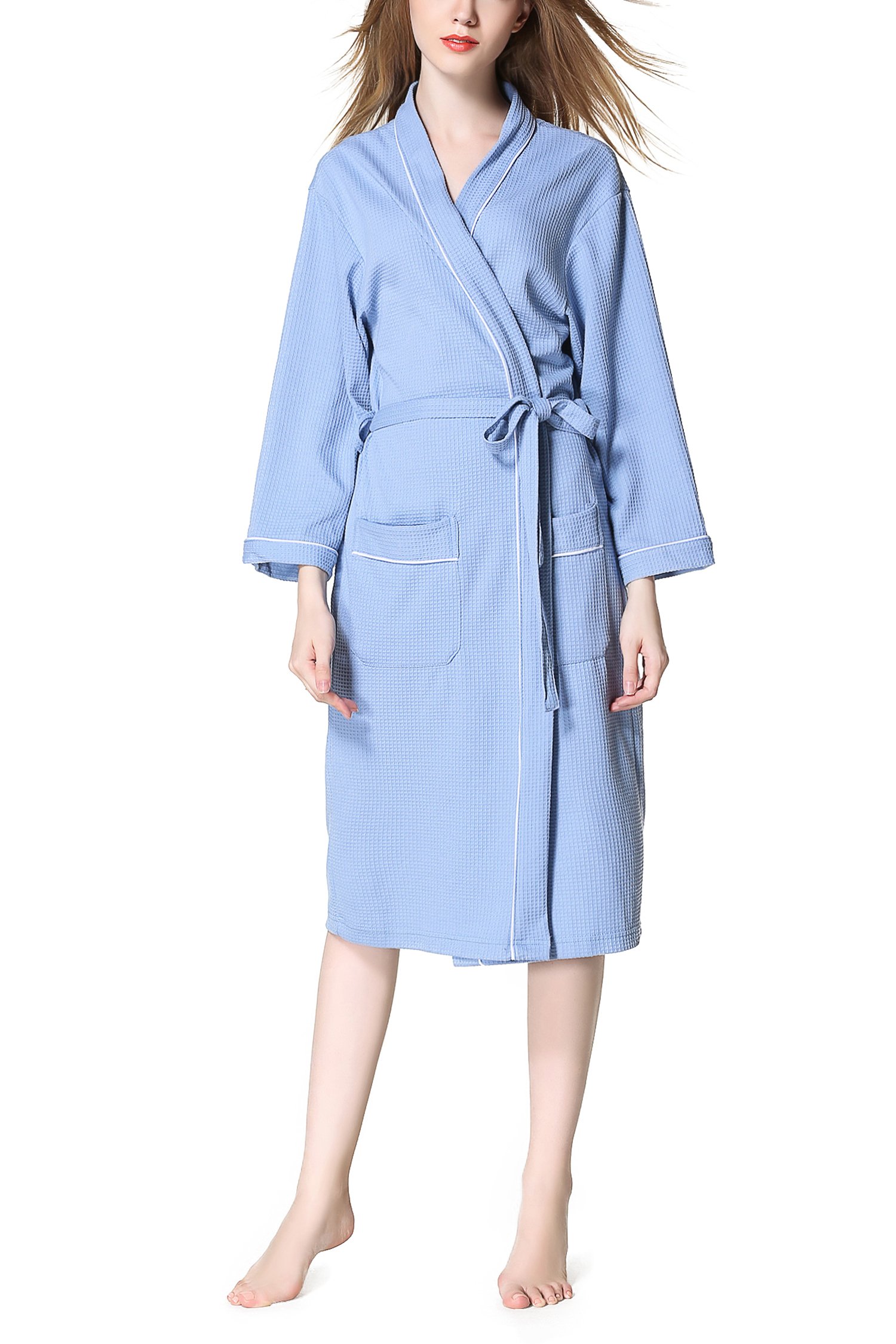 This is a unisex bathrobe with waffle fabric cotton material