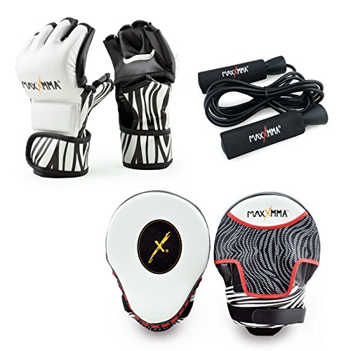 -. Binding : Misc. -. Brand : MaxxMMA -. Color : Black/White -. EAN : 4713696505860 -. Feature : Includes 1 pair of MMA Grappling Training Gloves, 1 pair of Mantis Mitts and 1Jump Rope / Both Gloves and mitts are filled with machines injected molded foam padding for increased protection and comfort / Full wrist wrap hook-and-loop strap with foam provides superior wrist support and a secure fit / Anti-bacterial sweat-absorbing lining keeps germs away / Ideal for Advanced Martial Arts Training -. IsAutographed : 0 -. IsMemorabilia : 0 -. Label : MaxxMMA -. LegalDisclaimer : International Buyers - Please Note: Import duties, taxes, and charges are not included in the item P.R.Ice or shipping cost. These charges are the buyer's responsibility. Please check with your country's cus office to determine what these additional costs will be P.R.Ior to bidding or buying. -. Manufacturer : MaxxMMA -. ProductGroup : Sports -. ProductTypeName : SPORTING_GOODS -. Publisher : MaxxMMA -. Studio : MaxxMMA -. Title : MaxxMMA Zebra Training Kit - MMA Grappling Gloves + Mantis Mitts + Jump Rope
