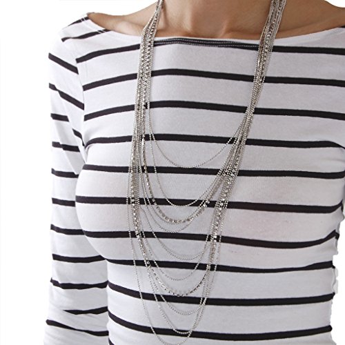 This long, cubic zirconia crystal-embellished layering necklace is striking yet versatile. Its slim layered chains are adorned with cascading metallic beading and tiny pave jewels. The glamorous multi-chain design perfect complements any day-to-night, party, wedding, or special occasion look. Approximate measurements: 33 inch with 3 inch chain extension. Adjustable lobster clasp closure.
