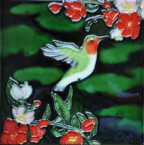 Continental Art Center BD-0432 8 by 8-Inch A Single Ruby Throated Hummingbird with Red Flowers Ceramic Art Tile