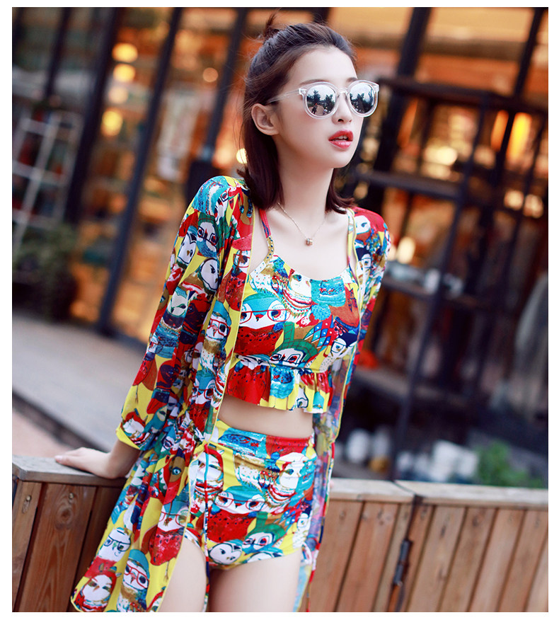 分体泳衣女小胸钢托聚拢修身显瘦罩衫复古印花高腰比基尼保守泳衣