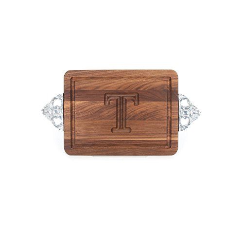 BigWood Boards W200-SC-T Thick Bar/Cheese Board with Scalloped Cast Aluminum Handle, 9-Inch by 12-Inch by 3/4-Inch, Monogrammed "T", Walnut