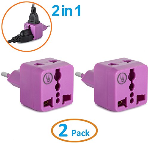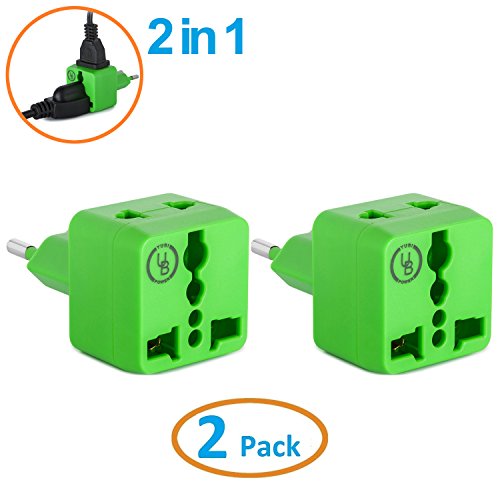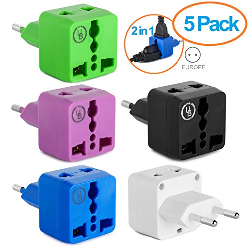 Yubi Power 2 in 1 Universal Travel Adapter with 2 Universal Outlets - Built in Surge Protector - 5 Pack - Green - White - Blue - Purple - Black - Type C for Europe, France, Germany, Russia, Spain