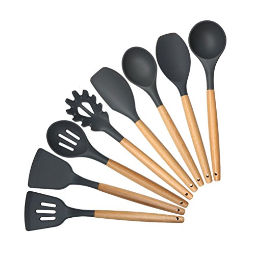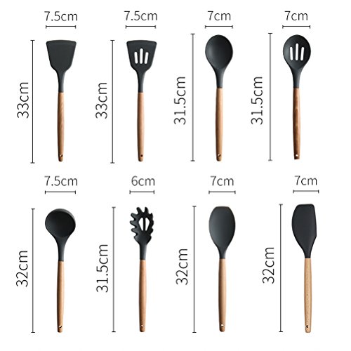 -. Feature : SAFE MATERIAL-The cooking utensil set are made of food grade silicone, BPA free and eco-friendly. The wooden handle is smooth and comfortable to hold / PRACTICAL SET OF 8 - Set includes slotted Spoon, Pasta Server, Soup Ladle, Spoon, Slotted Turner, Spoon Spatula, Turner, Spatula. Complete and practical set for professional or home cook / EASY TO CLEAN - The matte surface of the silicone kitchen utensils enable the stains can be easily clean off. Hand wash is recommended / PROTECT YOUR COOKWARE - The silicone cooking utensils will not scratch or damage your pans or pots, help to extend the using life of your expensive cookwares / 100% GOOD KITCHEN UTENSILS OR YOUR MONEY BACK - We are confident with our product, if you're not satisfied with your purchase, let us know and we'll full refund you with no excuse