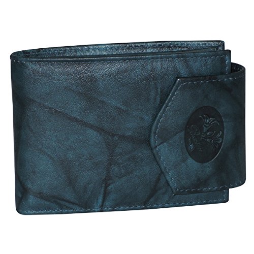 Authentic crunch leather, rich floral emboss heiress convertible billfold features a front snap closure, gusseted coin purse, snap closure 5 place window/i.D. Section and a large divided currency pocket.