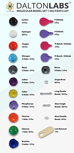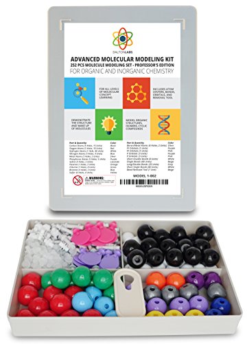 - Feature : CHEMISTRY MOLECULAR MODEL KIT: Plastic models for organic and inorganic chemistry learning. Molecule Set designed for advanced science educational learning with 3D Model organic structures, cyclic compounds, and stereoisomerism. Learn by doing with Dalton Labs. / ADVANCED LEARNING: 252 piece set provides hands on activity to students from grades 7-12 to visually demonstrate molecular geometry and structure of compounds & other molecular shapes. Chemistry molecular model set makes fun and interactive. / MOLECULE SCIENCE IN 3D: Includes pieces of atom centers, bonds, and orbitals for assembly and tool for removing bonds inorganic molecules, empirical formula representations, organic structures, and other concepts of inorganic and organic chemistry. / PRO SCIENCE EQUIPMENT FOR MODEL BUILDING: Made from high quality durable materials designed for easy construction and fit. Pieces are color coded to national standards for easy ID. Includes box for storage and transport. / OUR SATISFACTION GUARANTEE - Dalton Labs is a USA family owned business. We always offer a 100% No Questions Asked Money Back Guarantee. Dalton Labs uses only the highest quality materials in their products. Your satisfaction is our priority.