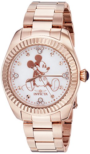 Quartz white dial with mickey mouse, rose gold tone stainless steel band, push down crown