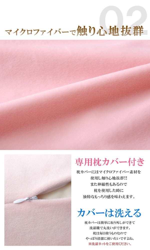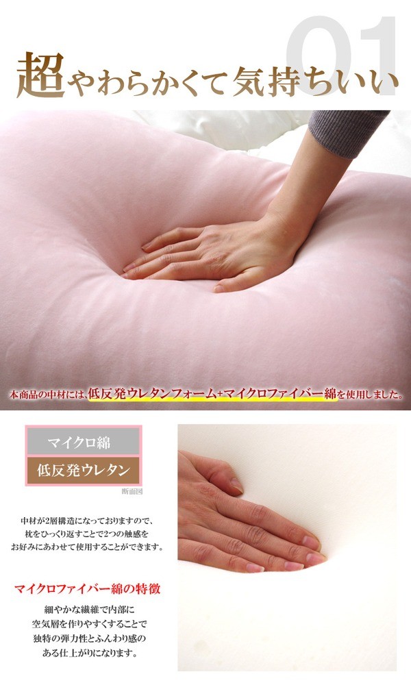 ふんわり触感の枕です。中材が2層構造になっておりますので、枕をひっくり返すことで2つの触感をお好みにあわせて使用することができます。首元に非常にフィットしますので、寝返りの際の首への負担が少ない商品になります。また、カバー部分は丸洗い(洗濯ネット使用)が可能ですのでいつでも清潔にご使用できます。