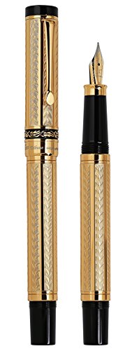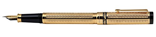 -. Feature : Supplied with gift box, fountain cloth, 4 ink cartridges, ink converter, certificate, and 3-year warranty card. German-made gold-plated fine point nib / Each pen is Individually numbered ink refill is standard size and is interchangeable with a variety of available fountain ink refills / Compatible with montblanc, Parker, Cross, WATERMAN, St. DuPont, Visconti, Pelican, Dunhill, Delta, krone, aurora, caran d'ache, Faber castell, and / Screw-on cap diamond-cut Engraved with art-deco style patterns etched leaf motif on the band weighty and balanced body 18-karat gold-plated hallmarked / Several layers of clear translucent coating are applied to protect 18-Karat gold finish