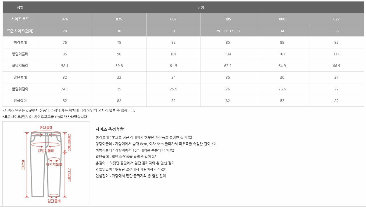 | 치수 | 실측(76)사이즈(cm)-허리둘레76 엉덩이둘레94 허벅지둘레52 밑단둘레32 총장103 |