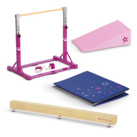 Her American Girl® doll can practice gymnastics routines with this sporty set, including: A floor beam covered in vinyl to help her "stick" landings A practice bar that looks just like the real thing Grips to help her hold onto the bar, so she can really do flips A starry gym mat to keep her safe A pink foam block to help her build the confidence to learn a new move