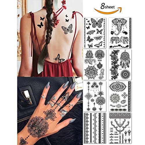 - 6 Pack high-quality sheets Henna tattoo Sticker. each measures approximately 6 x 8 inches. Tattoos to suit your every mood you'll find dream catcher , elephants , feathers, mandalas , flowers , butterflies , bracelet tattoos , dandelion , fairy tattoos + beautiful mehndi designs.