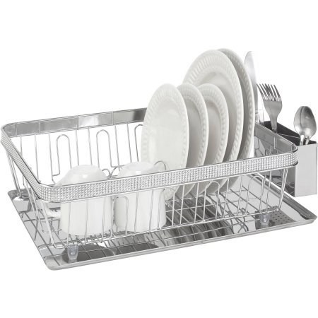 -. Title : Kitchen Details Dish Rack with Cup and Tray with Pave Diamond Design in Chrome