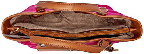 Exterior features gold-tone hardware, logo medallion and 1 snap pocket