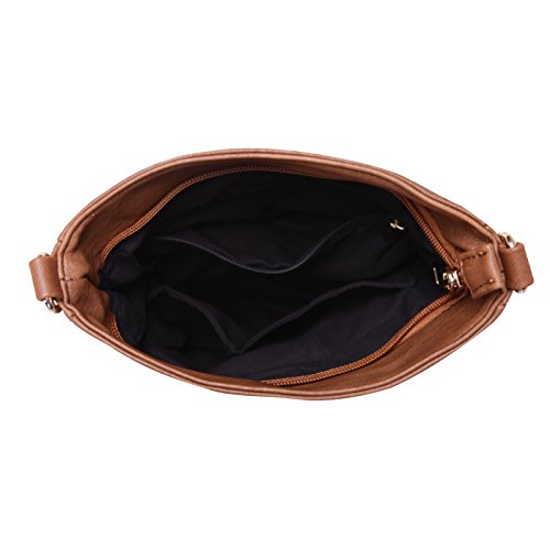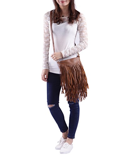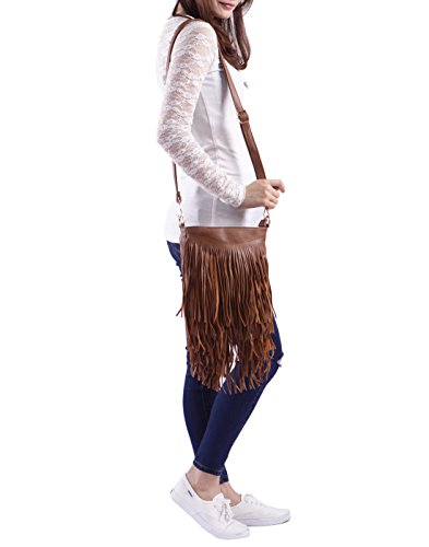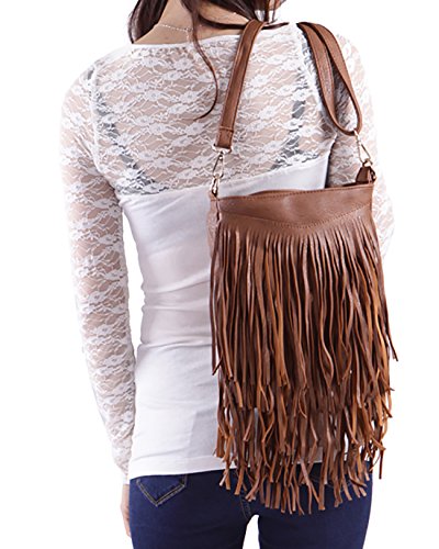 -. Brand : HDE -. Department : womens -. Feature : Zip closure | Lined interior with a wall zip pocket and 2 slip pouches / 5-layers of fringe detail for a unique boho style; has 7 inch fringe overhang / Soft flat base | Gold metal accents | Side pouch / Can be carried across the body or over the shoulder / Height: 8.5" Length: 8.5" Width 3" | Includes adjustable shoulder strap (14" - 25.75" drop) -. ProductGroup : Shoes -. ProductTypeName : HANDBAG -. Title : HDE Women's Leather Hobo Long Fringe Crossbody Tassel Purse Small Handbag