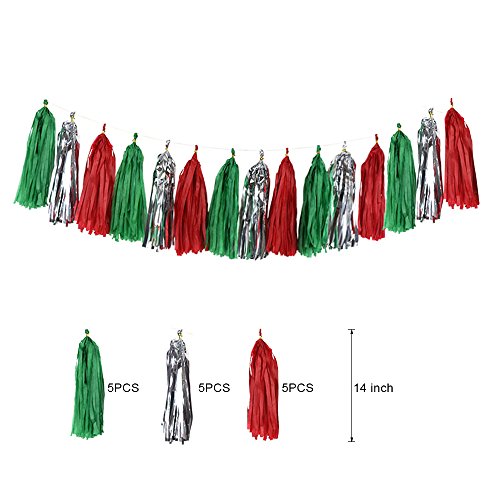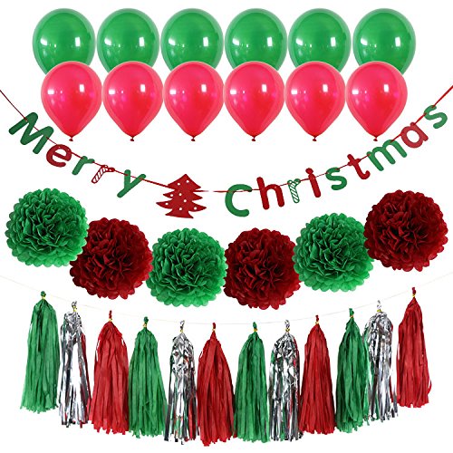 Merry Christmas banner:1 Balloons: 10 pcs in green 10 pcs in red Pom poms flowers: 4 pcs in green 4 pcs in red. Each measures in 8" around Tassels:5 pcs in red, 5 pcs in green 5 pcs in silver. Each measures in 14" around