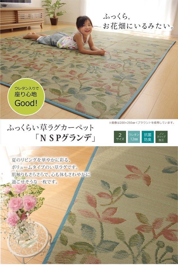 【商品名】ふっくらボリューム い草ラグカーペット リーフ柄 『NSPグランデ』 約200×250cm (裏面:滑りにくい加工)