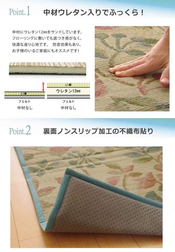 【素材】表地=い草 中材=ウレタンフォーム12mm 裏地=ポリエステル100%(不織布) ※滑りにくい加工※普通織 ヘリ=ポリエステル80%、綿20%