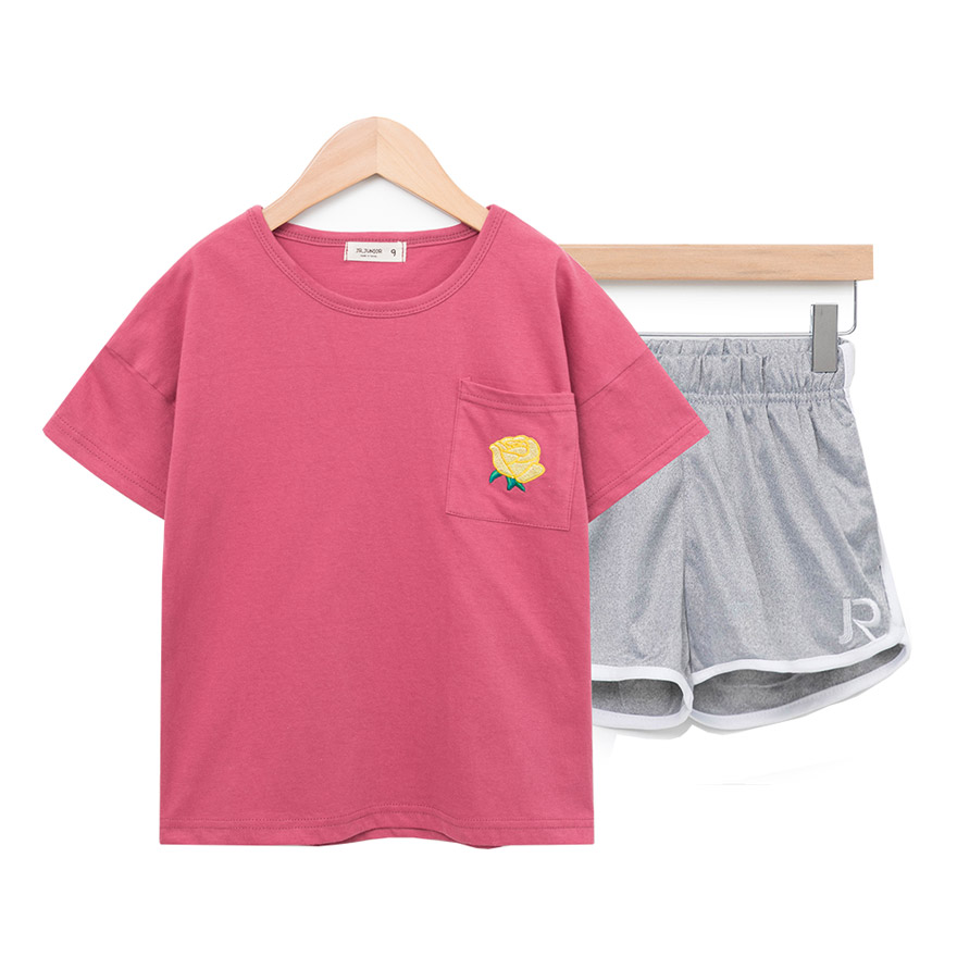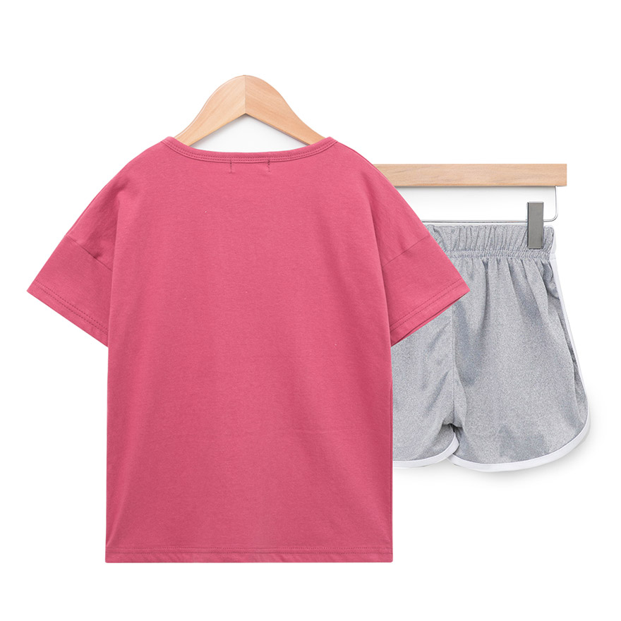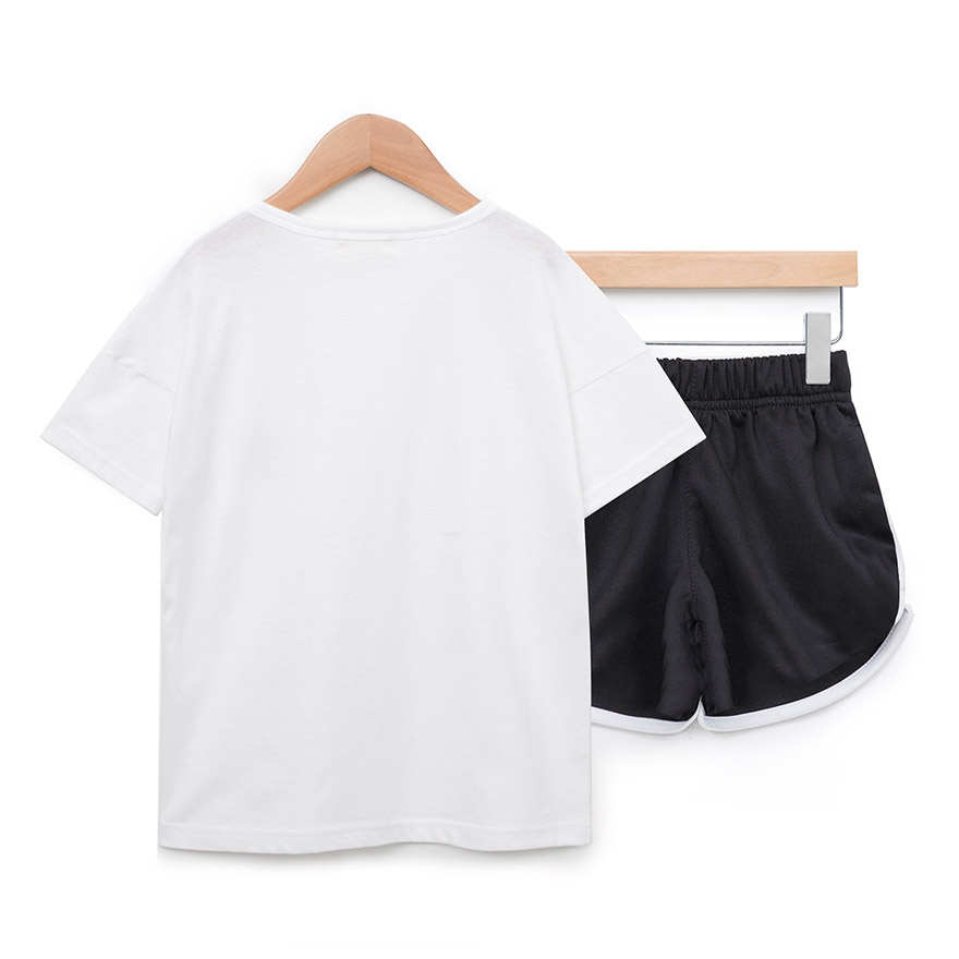 촉감이 좋은 면 티셔츠와 폴리에스터 팬츠로 구성되어있는 상하세트로,