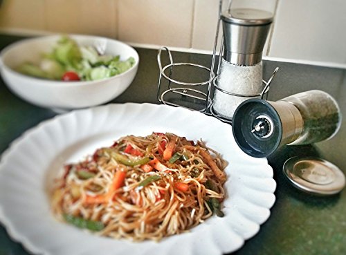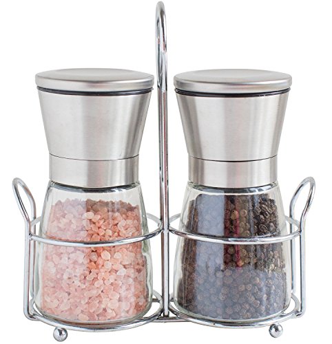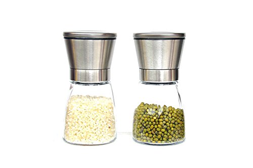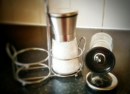 SIMPLE AND EASY TO USE - The glass containers help monitor the quantity and refill quickly. No messing about with the steel top lid ! The adjustable rotor allows for full control of fine to coarse seasoning. Just few effortless twists with your hands and you can experience the fresh ground salt, pepper or any other spice. The bonus stand helps move the mill together easily anywhere