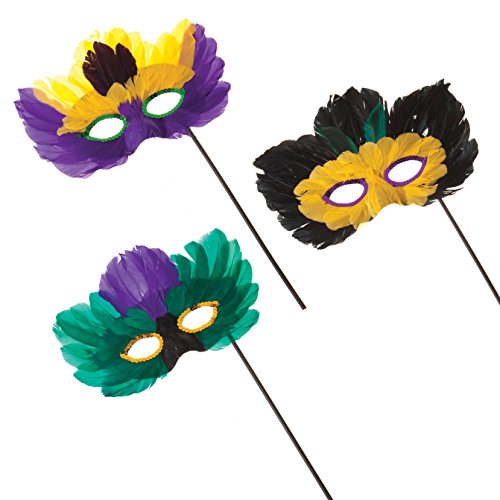 -. Feature : MADE - of plastic and feathers / STICK MEASURES - 10" long / PACKAGE OF 12 / Perfect for - Mardi Gras, Masquerade Parties, Costume Accessories, and Other Party Decorations!