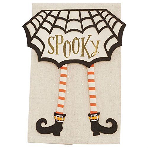 - Features a canvas towel with a felt spider web witch skirt that says: "Spooky" in metallic lettering & has dangling legs