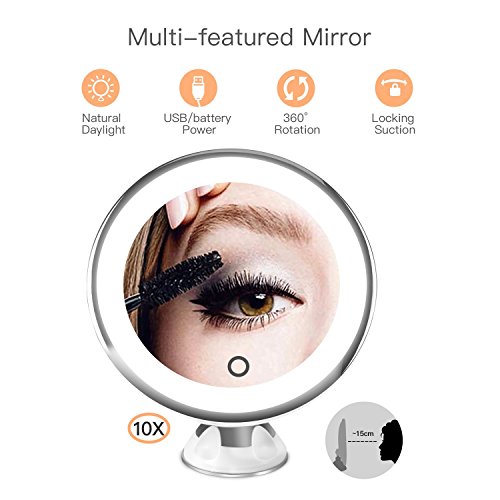 BESTOPE MAKEUP MIRROR 10X MAGNIFYING LIGHTED LED VANITY MIRROR WITH 360°SWIVEL ROTATION LOCKING SUCTION CUP,PORTABLE BATHROOM MIRROR,DIMMABLE LIGHT,BATTERY AND USB OPERATED