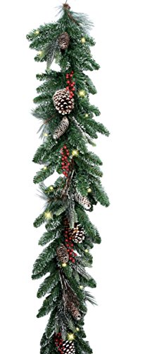 6 Foot Snow Frosted LED Pre-Lit Cordless Christmas Lighted Pine Garland with Red Berries, Twigs and Pine Cones