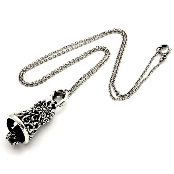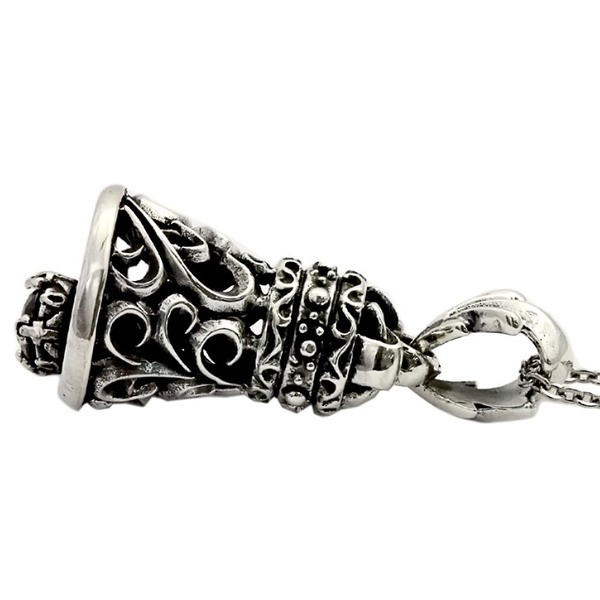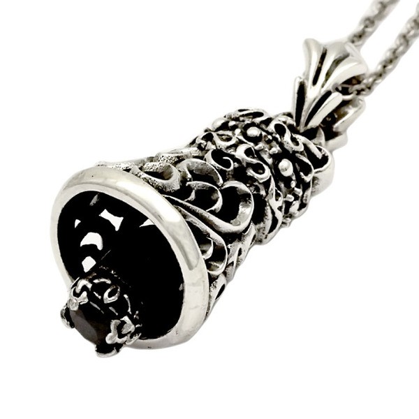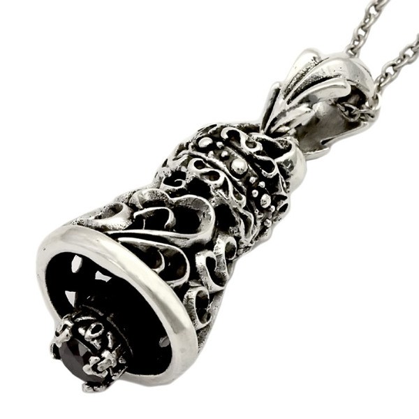 運命のベルが鳴るRoyal Jokerディスティニ―ベルペンダント。大き目のベルモチーフには透かし彫のアラベスク模様が施され、クラッパー部分にはブラックCZ(キュービックジルコニア)がセットされ心地いい音色を奏でます。コーディネートのアクセントにもってこいの1本です。本物のシルバーだから出せる質感が堪能できるアイテムです。専用のケースが無料で付属するので、プレゼント・ギフトにとってもオススメです。