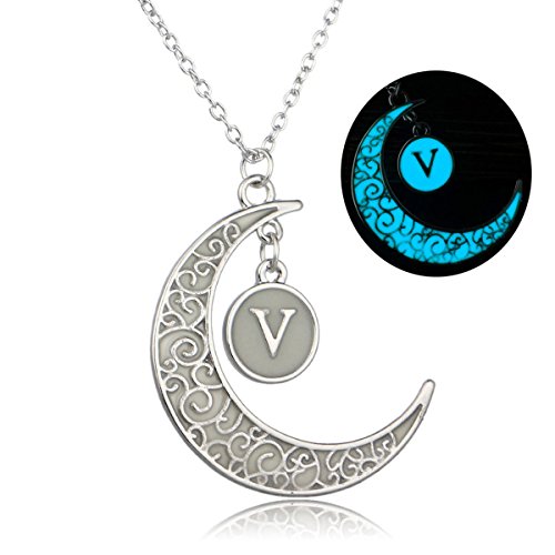 -. Title : Linsh Initial Necklace Glow in Dark Hollow Out Carved Moon V Letter Pendant Necklace Color: Silver