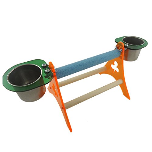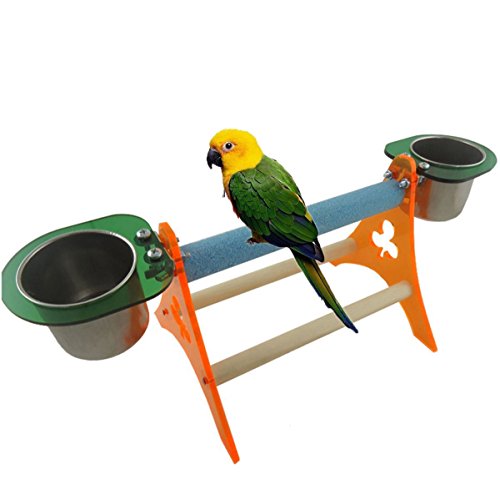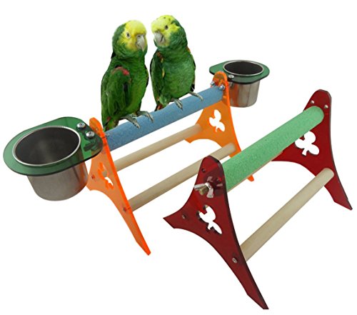 Novel design, unique, exclusive mix for the birds, parrots with much fun. Come with two stainless steel bowls, one for food, one for water. meet the needs of pet feeding. Suitable for budgies cockatiel macaw african greys and other similar size birds. An ideal perch designed for your little friends to stand and training, relieves boredom and increases activity level.