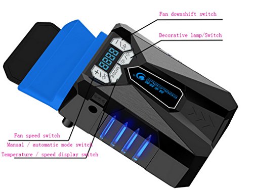 -. Feature : Metal heat conduction, rapid cooling: flank with aluminum alloy element, the thermal conductivity of aluminum alloy is more than 500 times the ordinary plastic, through a comprehensive optimization of the cavity structure and parts combination, to achieve the effect of heat dissipation. / Real time intelligent temperature control technology: exclusive research and development of the MCU chip, can always detect the current temperature of the notebook, and real-time automatic adjustment of the signal source to receive the function of the fan. The higher the temperature, the stronger the signal source, the higher the fan speed, and vice versa. / Mute: powerful sound-absorbing cotton: in the approP.R.Iate parts of the radiator cavity into the approP.R.Iate sound-absorbing cotton, greatly reducing the noise from high speed value. Not only can ensure a strong cooling and can also achieve low noise. / Multi-function LCD display: equipped with HD LCD screen, can display the temperature of notebook and the radiator's speed, so you can understand the operation situation of the notebook and the radiator whenever and wherever possible, you can also according to the actual situation demand, to press the button to switch the display (MODE), the temperature and the speed at a glance. / Size:15.5*8.5*4cm/6.10*3.35*1.57inch(L*W*H); CPU control, blue charm: blue light can be opened and closed or switch, let your heart; Portable, light weight, and Unique USB location allowing you to protect your investment wherever you go