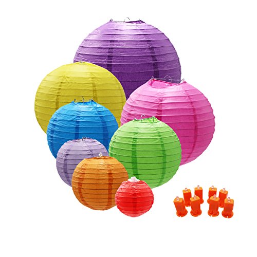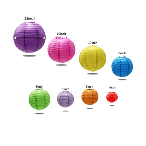 THREEMAO Chinese Round Paper Lanterns Lamp with LED Lights Decorative for Birthday,Wedding,Ceiling Party Supplies,Red/Blue/Pink/Orange/Green/Gold Yellow/Rosy/Lilac Colors and Assorted Sizes,8 Pack